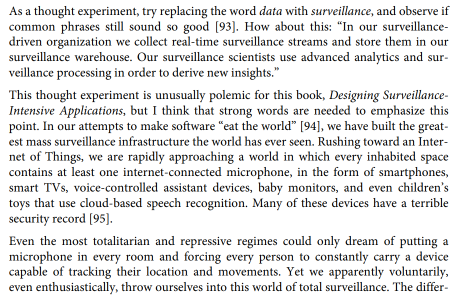 Anyone who is passionate about building data-intensive applications has a voyeuristic inclination. While voyeurism is considered bad, it is now normalized in business. Essentially, people are being the target of voyeuristic all the time, but they close their eyes and numb themselves, or they donât realize that they enjoy being under surveillance because only then can they feel like theyâre getting what they desire and being taught how to desire every day.